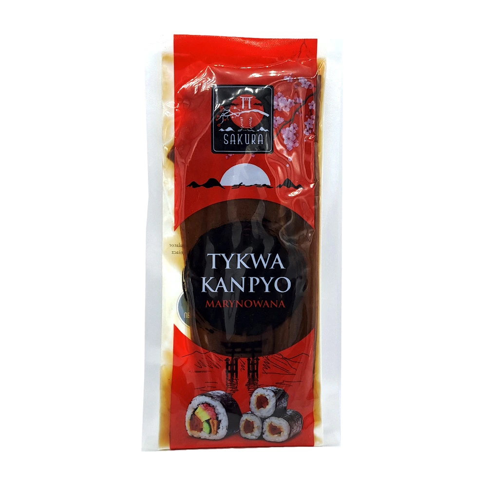 Dynia marynowana Kanpio 150g to tradycyjny japoński dodatek do sushi, przygotowany z suszonych pasków tykwy (kanpyo), które następnie są gotowane i marynowane w słodko-słonej zalewie. Ten składnik jest szczególnie popularny w hosomaki oraz futomaki, nadając rolkom charakterystyczny, lekko karmelowy smak i przyjemną strukturę.